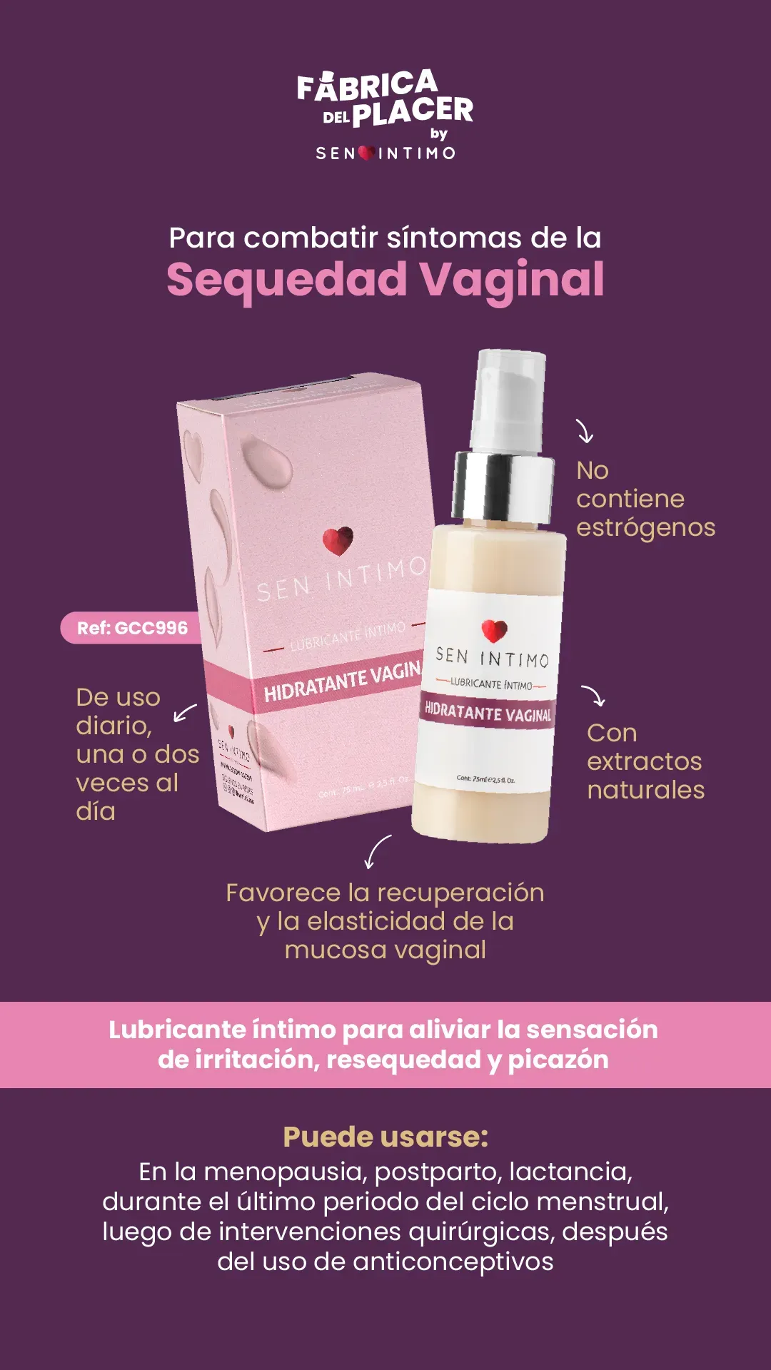 El Hidratante Vaginal Sen Íntimo, favorece la recuperación y la elasticidad de la mucosa vaginal, ideal para la resequedad que ocurre en la menopausia, embarazo, post parto, uso de pastillas, tratamientos médicos, diabetes, hipertensión, entre otros.